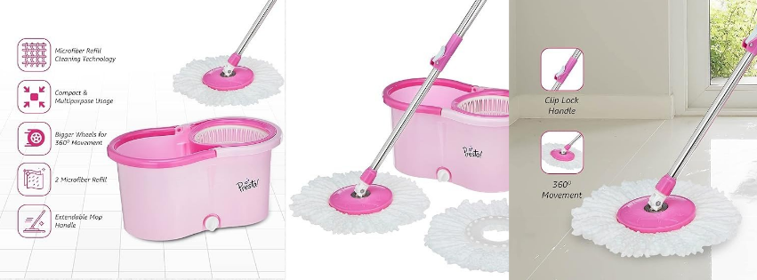 Includes bucket, handle, mop plate, 2 refills, rubber knob.